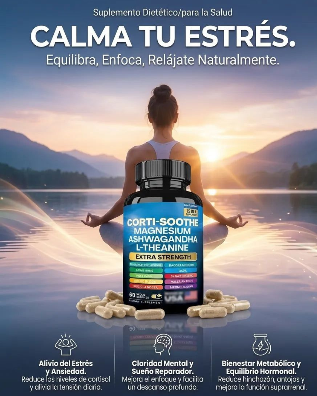 🌿 Fórmula 3 en 1 Magnesio Glicinato, Ashwagandha y L-Teanina |